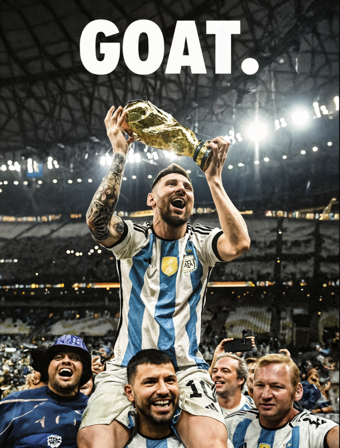 Lionel Messi en la cúspide de su carrera, celebrando el Mundial de 2022. Lo que la hace aún más especial es que no está solo: está subido a hombros de su gran amigo Sergio "Kun" Agüero.